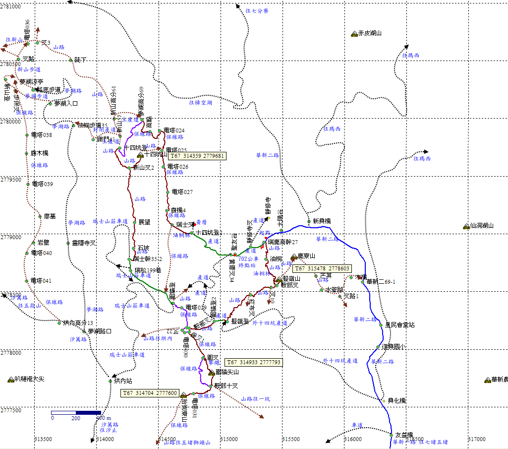 叉路,接上保線路,左往圍貓尖、台狗寮山,右往烘內、十四坑山、瑞士山莊,取左登頂再回。保線路路況極佳,不過中途有段芒草區,雜草較多。H230m |