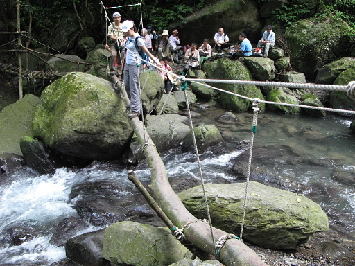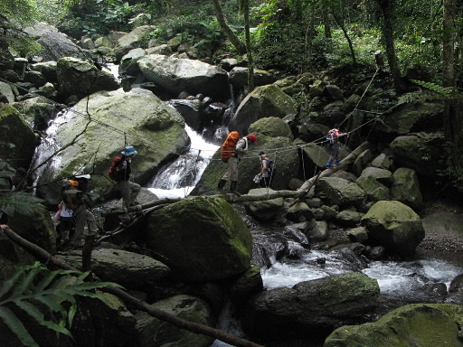 第三次過溪,較大支流,架設有獨木橋,應該常被大水沖毀,因此每次來橋的模樣都不同。依序通過獨木橋,兩旁有穩固的繩索輔助,通過不難。H552m |