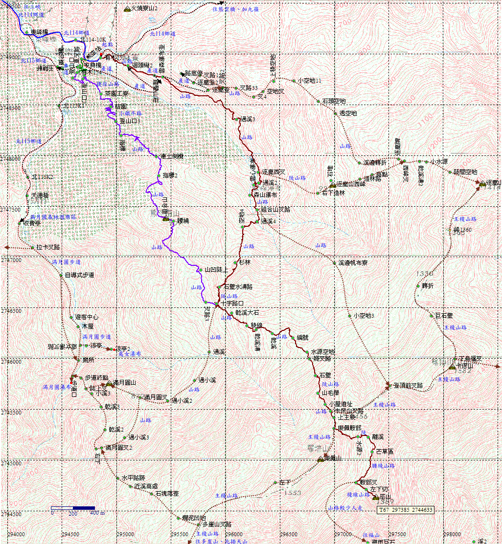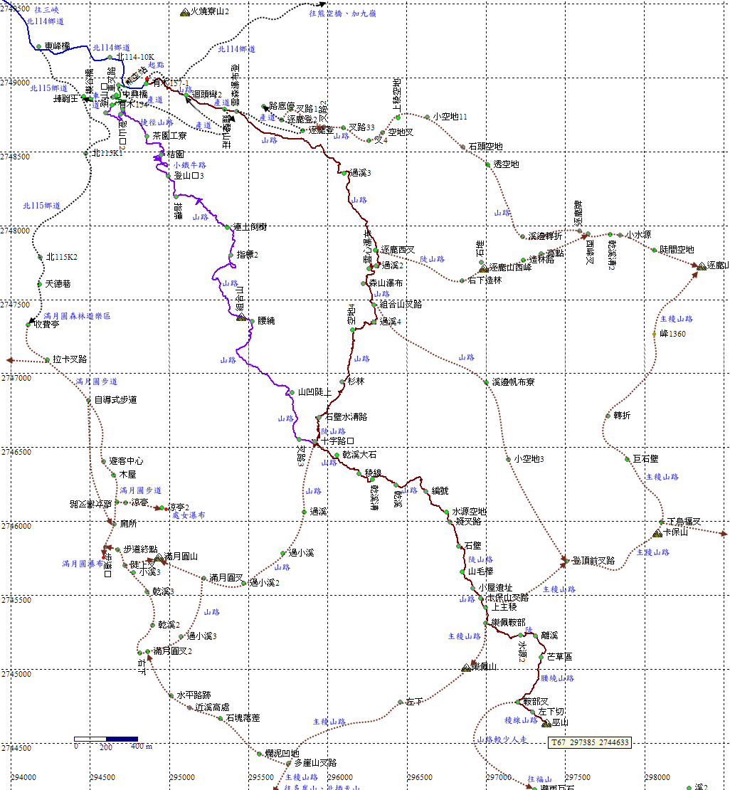 組合山叉路,直上往樂佩山160分,往卡保山185分;右往滿月圓山120分,亦可登樂佩山、組合山。取右,先略往上,再轉往下。H675m |