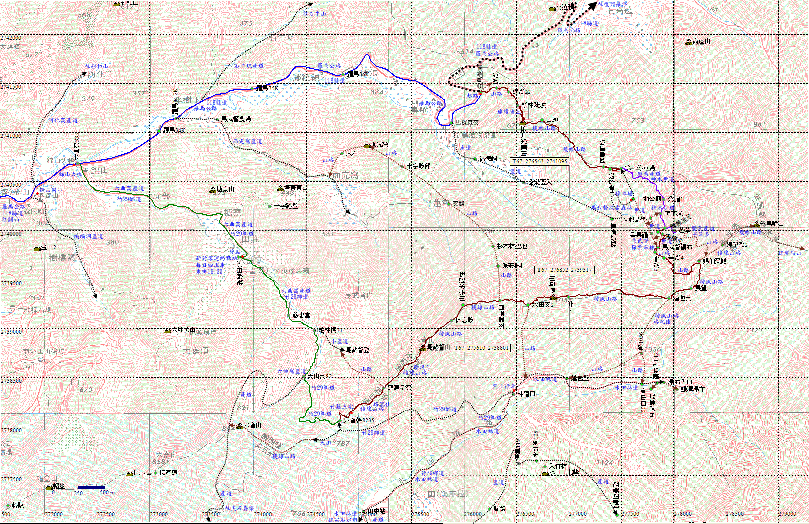 柏林橋叉路,右側過柏林橋可往馬武督山另一登山口,柏林橋小而不起眼。六畜高幹71電線桿。續前行。H511m |