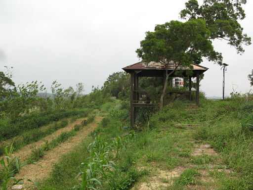 涼亭與公廁,都已荒廢,步道與土產道合一。休息。展望不錯,眺望老崎坪頂山。此處與老崎坪頂山所夾的山谷正在大興土木,似乎是修路,有座大橋。H151m |