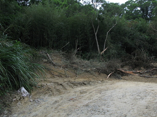 土石流溝,此處最接近水流東山,循著土石流硬上,差十幾公尺即可上稜,但雜草茂密且陡峭,放棄。H135m |
