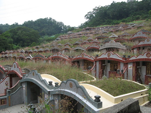 回到公墓區,左右循車道皆可下山,取左,繞較遠。公墓區展望其實不錯,遠眺峨眉湖與大彌勒佛。這座公墓的墳墓排得真整齊,足為典範。H168m |