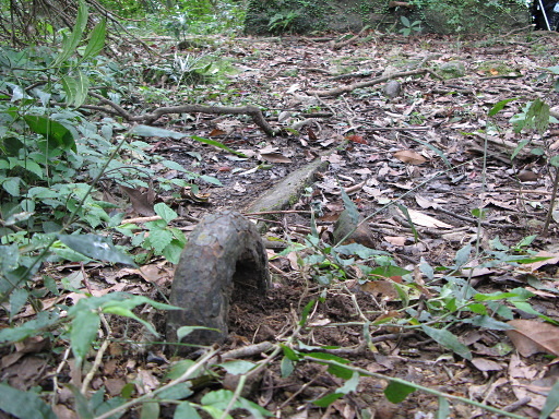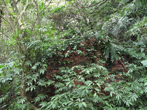 竹叢鞍部,在稜線左側幾公尺處發現一座古老的石砌小廟,雜草掩蓋,很難發現。清除一些雜草之後,還是無法辨認到底是土地公廟?還是有應公廟?如果一坑古道會走到這裡的話,由此處上稜應該比較合理。H532m |