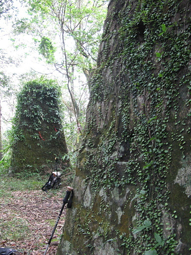 作埤內叉路,鞍部,直行往耳空龜山約30分,右下往作埤內、內曾路、菁桐古道汐止段。直行約10公尺即是奇特的雙石塔所在。H520m |