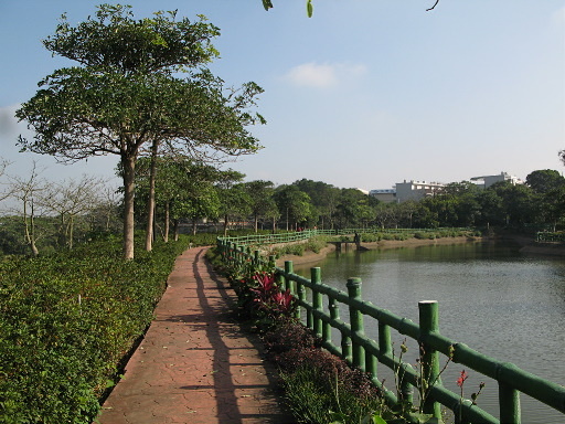 秀才5B埤塘公園,入口有『秀才山下綠意盎然』大石,步道可環湖一圈,左去右回。這座埤塘名為『秀才山麓五B池』,處於都市邊緣,風景還不錯。湖中有鴨群約20隻,牠們的房子傾倒在湖邊。H206m |