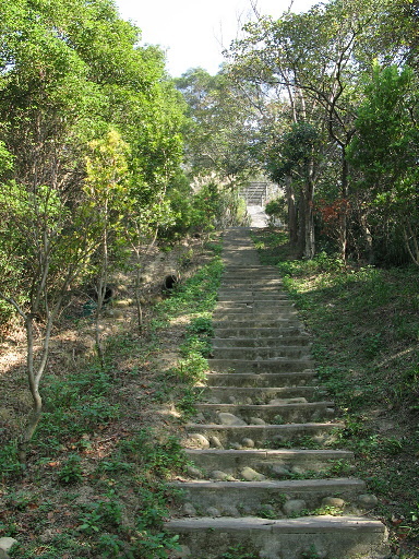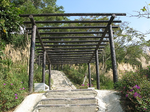 秀才登山步道入口,位於產道叉路口附近,旁邊有座福德祠,設有小牌樓與地圖,地圖居然是楊梅鎮各景點的概圖,而非步道本身的路線圖,用處不大。步道剛開始有一段長約20公尺的綠拱廊,頗為別緻。過了拱廊之後,步道左轉一路陡上,步道階梯是仿木紋水泥板。爬得越高展望越好,回頭可遠眺老窩山。H248m |