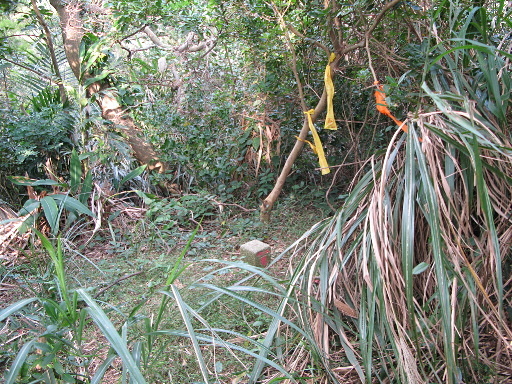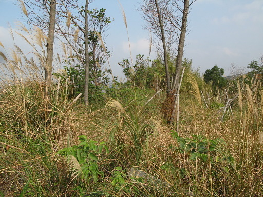 不明登山口,發現少量登山路條與基石噴漆,但我從來不知道這裡有基石存在。取左進入產道旁荒地搜尋。山頂雖然不難到達,但雜草叢生,又不知道要在哪裡找什麼?只能碰碰運氣。不久只在荒地內發現一根水泥柱,但是不像會被當成基石者。後來又在東北側發現另一水泥柱。實在找不到,最後再度從登山口開始,仔細跟蹤路條,確實只到產道旁山頂處而已,在最後路條處努力找尋,最終還是枉然。H317m |