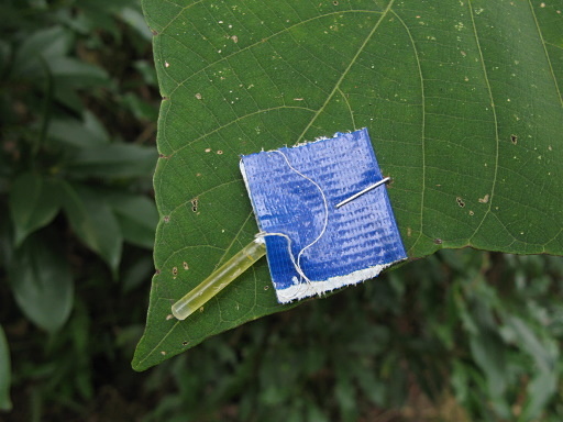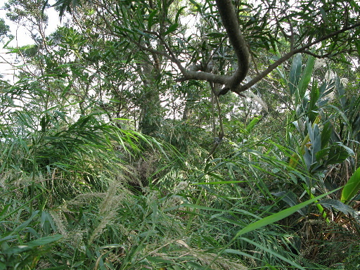 不明登山口,發現不少路條,沿著馬路檔土牆而行,再急轉直上。前車之鑑尚不遠,但我還是受不了誘惑,跟著路條去爬莫名其妙山。山路其實並不算難走,這是唯一可以安慰的。五分鐘之後登上無名山頂,長滿密密麻麻的蘆竹,找不到任何基石。續往前下坡,確認已無路條再回山頂搜尋。最後仍舊無功而返。H248m |