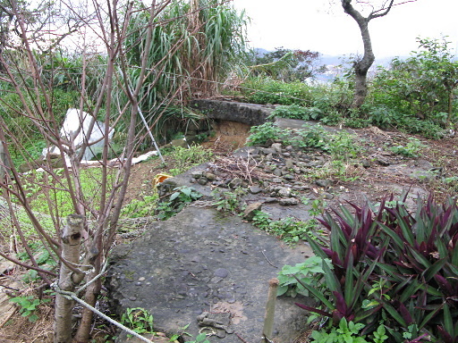 旭丘砲台,總共至少有五個砲座,其中三個是扇形,一字排開,所圍成的區域內都被開發成菜園;另兩個為圓形陣地,較為偏僻,一在靠近八尺門方向,一在右後側的小山頭。因鄰近八尺門,也有人稱它為八尺門砲台。因雨這次只參觀菜園內的三個扇形砲座,回程發現菜園女主人已來了,還把狗鍊放長,導致我們無法自行通過狗關,還好最後她聽到狗吠聲來幫忙安撫狗狗,讓我們通過。H86m |