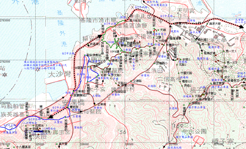 正濱國中操場,靠近海軍醫院端有步道往下,可回海軍醫院或下往祥豐街177巷。直接穿越操場。H65m |