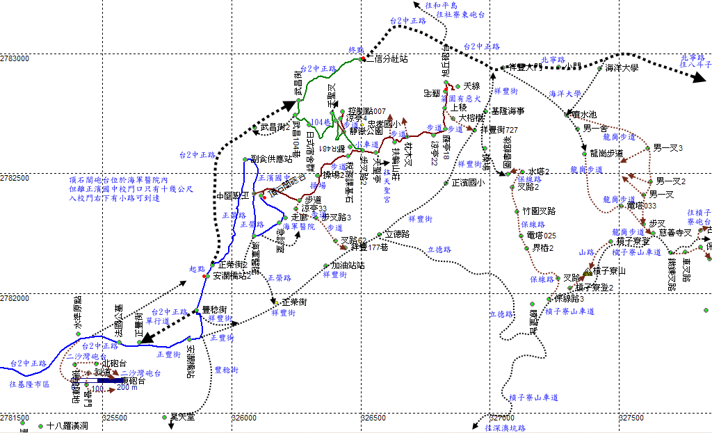 旭丘早起會廣場,扶輪山莊,續行取左,再度轉為水泥小徑,大致循稜而行。這附近有兩條步道叉路往左下山,應可出中正路。續前行。H80m |