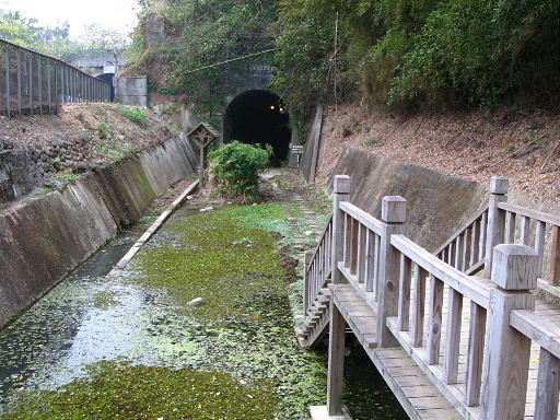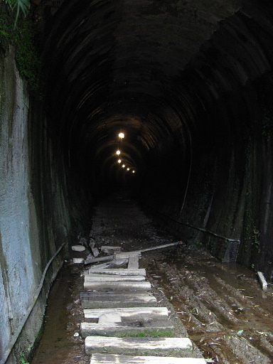 功維敘舊隧道,『苗栗隧道於明治35年(西元1902年)6月25日開工,明治36年(西元1903年)3月31日完工,北口有台灣總督兒玉源太郎所題的「功維敘」三個大字。1935年大地震之後,於昭和13年(西元1938年)2月整修完竣,恢復通車。民國87年(西元1998年)因山線鐵路雙軌通車停駛。...』隧道內設有燈光,全天開放通行。H87m |