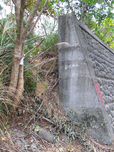 產道路底,續行為雜草叢生的小徑,有些路條,路跡還算明顯。幾十公尺後前方可見高高的圍牆,小徑偏右往下,稍後才發現已偏離基石處,退回。正路為到達離圍牆不到十公尺時,應左入草叢,約十公尺的圍牆旁樹上有很多路條。H161m |