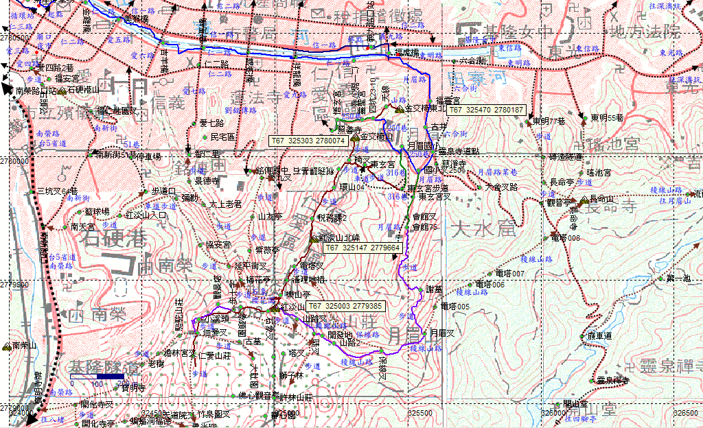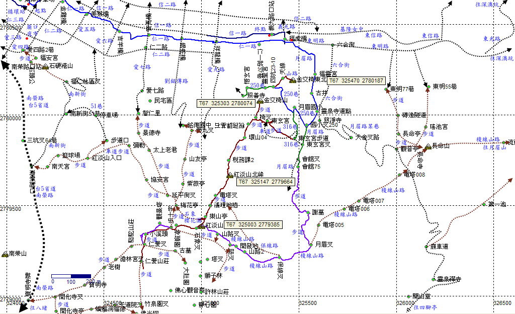 東玄宮,續行從廟左的步道上山。往紅淡山、金交椅山。H72m |