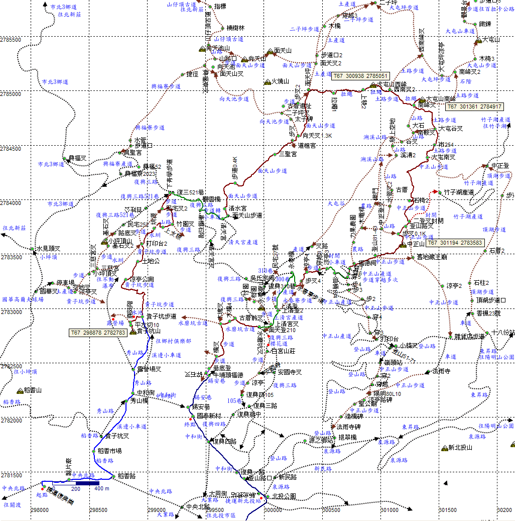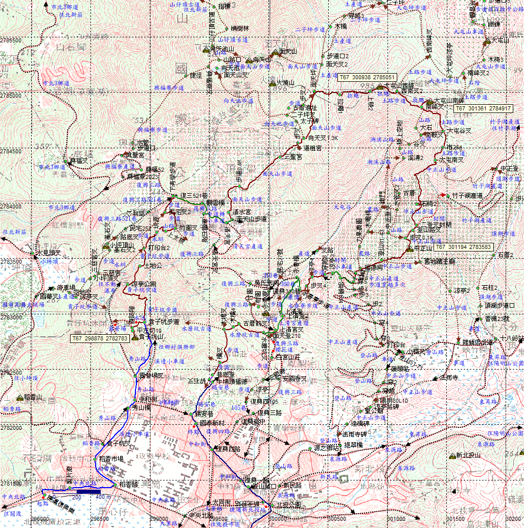 上清宮,剛剛所走的這條溪邊小車道禁止行車,為台北市建設局溪溝清疏道路。上清宮旁發現永春寮溪步道之上清宮登山口,石階步道往上,應可接回300巷。循上清宮車道往復興三路。稍後木橋處再發現永春寮步道之上清宮登山口,往上應可接到剛剛下山之路,有機會再來探。H224m |