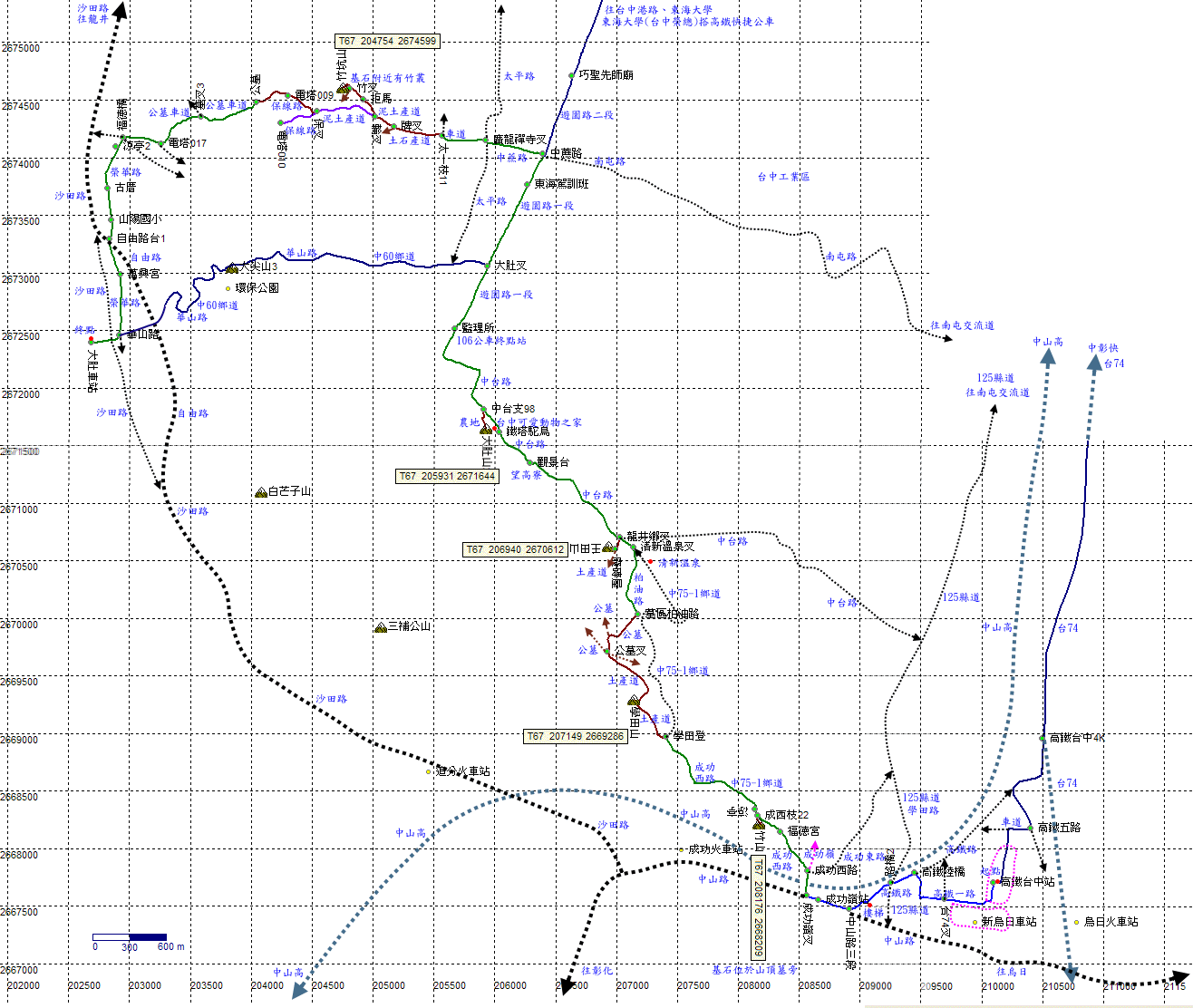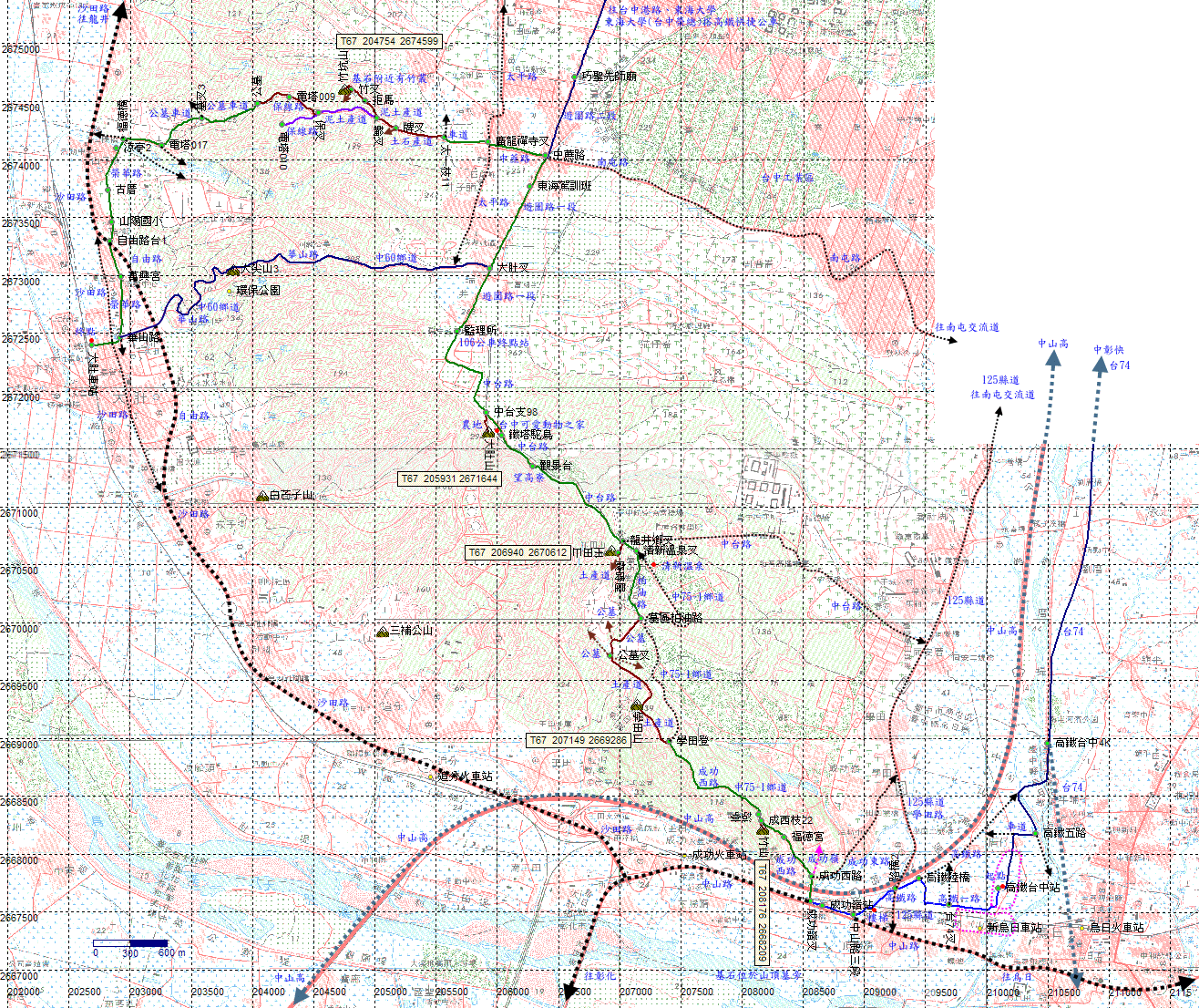高鐵路二段,鄰近中山高,取左往成功嶺。到底走階梯上高鐵陸橋,越過鐵道再下平面道路。H38m |