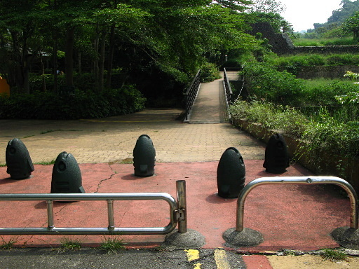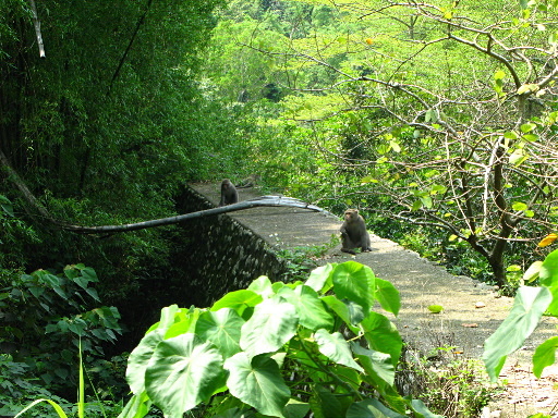 豐柏廣場入口,含萱橋(草字頭的含,音ㄏㄢˋ),左側有另一車道從山腳路過來,右轉,進入廣場找登廟步道入口,後來發現其實可以不必進入廣場,直行遇叉路取右即可。繞了一圈,在對角位置接上另一步道,以為接上登廟步道了,取右往上。結果立刻接上通往登廟步道入口的產道。這一帶為獼猴生態保護區,在豐柏廣場就可見到不怎麼怕人的台灣獼猴。H133m |