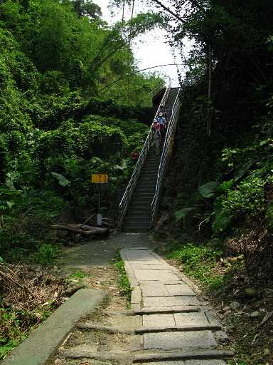 第四涼亭,產道路底,開始轉為階梯步道,涼亭旁為舊路,左上舊階梯往豐柏路,亦可往受天宮,登廟步道正路偏右,直上陡峭的鐵梯,一路往上。鐵梯完了轉為石階繼續陡上。H312m |