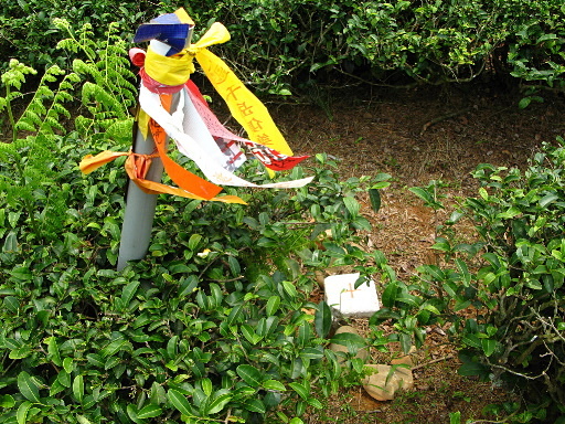 松柏坑山,430m,二等三角點No.1067。又稱松柏嶺山、獅子頭山。台灣小百岳。基石位於茶園中,旁邊插了一根水管,上面綁了很多路條,因此頗顯眼。H435m |