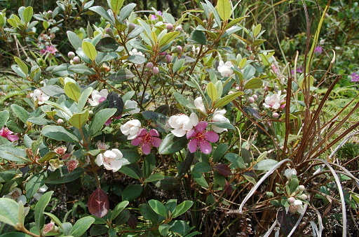 續行,水泥步道循稜緩上,較多遮蔽。附近山區正值桃金孃花盛開,美不勝收。 |