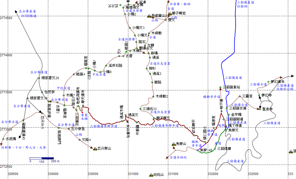 出發,循小路往三貂嶺隧道,稍後即轉為鐵軌旁小徑,宜蘭縣鐵路火車從旁呼嘯而過頗刺激。 |