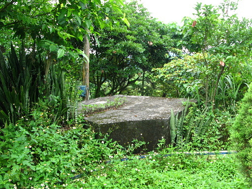 疑似砲台,位於小丘頂端,規模很像,但周圍只有少許磚牆與石塊。續行偏右繞下至另一菜園。繞回早起會途中發現頗奇特的水泥建物,除了是砲台或碉堡遺跡之外,想不出還會有什麼用途? |