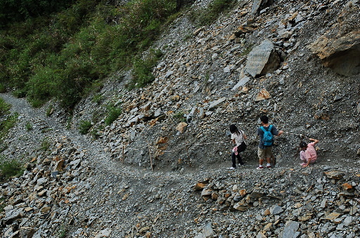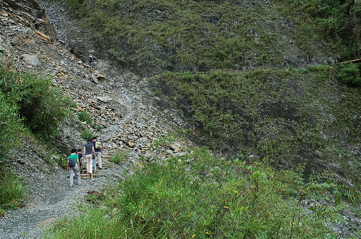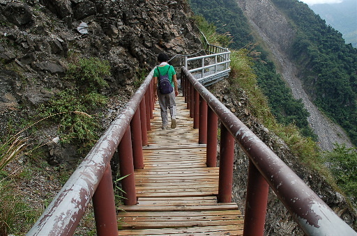 步道叉路,左上為水泥產道,直行為八通關古道,往雲龍瀑布2.6K。稍後開始第一個難關,崩塌落石區,小心通過。八通關古道沿著岩壁旁開鑿,如果沒有棧橋與護欄,將會是非常恐怖的路程。H1308m |