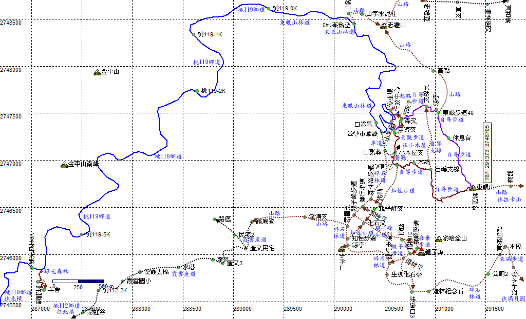 續行,離開東眼山森林遊樂區,循桃119鄉道下山。 |