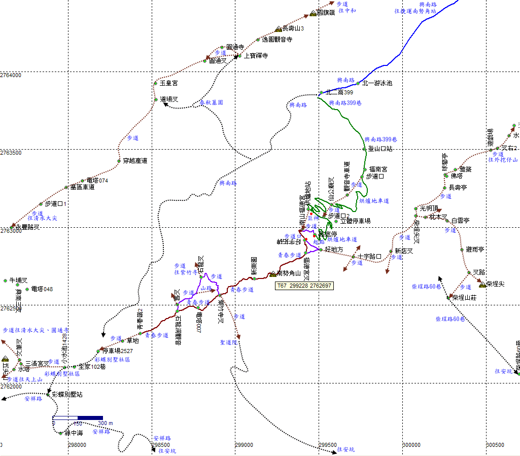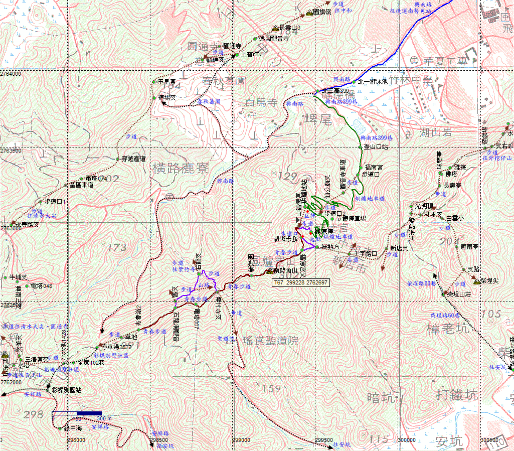 南山福德宮叉路,接上南勢角山稜線步道,左往華夏工專(華夏技術學院),右往南勢角山,取右。沿途有青春步道指標。H276m |