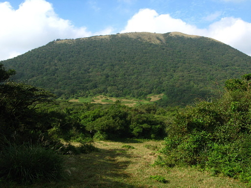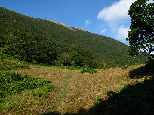 續行,進入富士古道大草原,有些山友稱此地為富士坪,不過官方地圖上的富士坪其實就是溪底分校那一帶,而且有富士坪福德宮可為證明。稍後路右可見迷你的大尖池,小小的牛隻水池而已,遠方可見難得露臉的磺嘴山。H651m |