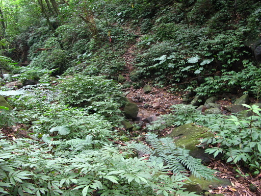 古道貼近小溪,但不過溪,雜草頗茂密,注意路條。 |