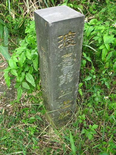 溪底古道入口,位於小產道竹叢旁,旁邊有座光緒年間的大學生賴公古墓,古墓旁有根石柱,標示『渡臺第四世祖』。循小水泥產道往下。H362m |