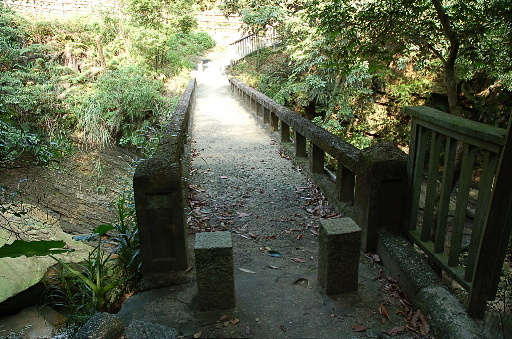續行,循產道往興化橋1500公尺、往友新橋500公尺。稍後路左有座石砌建物,往友蚋溪中望去,發現高架的輕便車橋墩。接近友新橋附近有親水步道,不過相當短,而且有些荒廢。 |