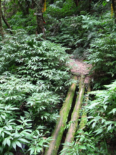 雷公坡福德祠叉路,位於第二座樹幹小橋處,左下往雷公坡福德祠(越嶺古道保線路)、秀峰路105號,直行往中嶺山、雞心尖、秀峰路、蕃薯寮。這條通往雷公坡福德祠的古道入口已被雜草覆蓋,不必過橋,循小溪左岸往下走,很快路況即轉明朗,只是路條極少。H433m |