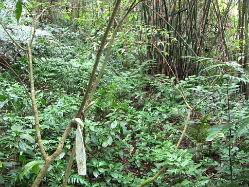 竹叢,附近處處可穿越,一時找不到正路,稍後才發現有一老舊路條指示要往下走,不久轉為古老的石階一路下往溪邊,沿途路條極少,走得有些忐忑。H435m |