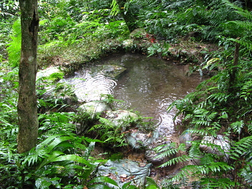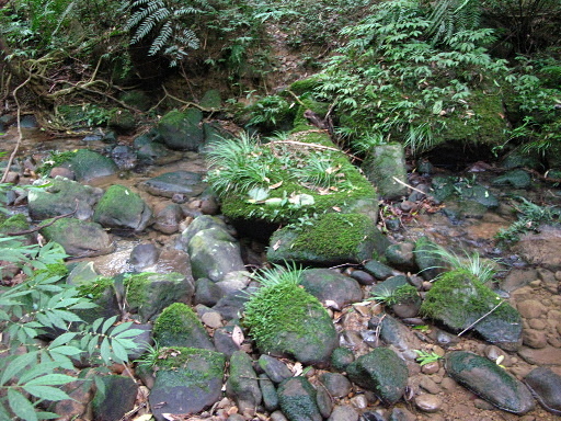 回到基點叉路,續行下往蕃薯寮,路況仍佳,坡度一路緩降。不久下降至小溪邊,開始出現一階階的駁坎。H538m |