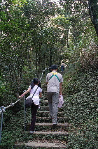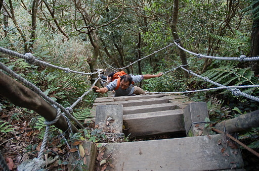 續行,循枕木步道陡上,回頭可遠眺猴洞尖、向天湖山、高腰山、拔刀爾山。很快即出現極陡崖梯,幾近垂直,猶如天梯。現在的安全措施已越來越完善,除非有懼高症,爬起來驚而不險,令人印象深刻。登上第一階段天梯之後,展望極佳,可俯瞰觀獅坪、猴洞尖,亦可遠眺新店市。接著是第二階段天梯,比較短,就沒什麼感覺了。 |