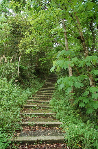 老頭擺客家菜,位於竹37鄉道往冷泉的路上,其旁有高旗崠桐花步道入口標示,水泥階梯往上,由此起登大分林山。經過老頭擺廁所旁,另有大分林步道路線圖。稍後水泥路轉為寬大的石階步道一路往上略陡。中途有些油桐樹,目前尚未開花。H174m |