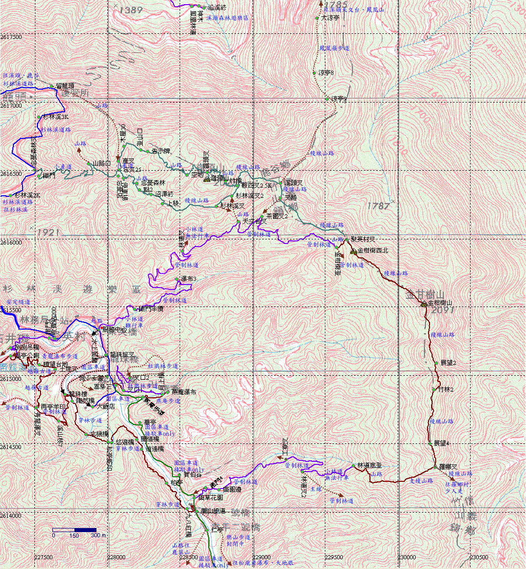 1叉口,左下往森林浴入口3分,直行往2叉口8分鐘、森林浴場繞一圈約一小時,直行,開始蜿蜒向上。H1709m |
