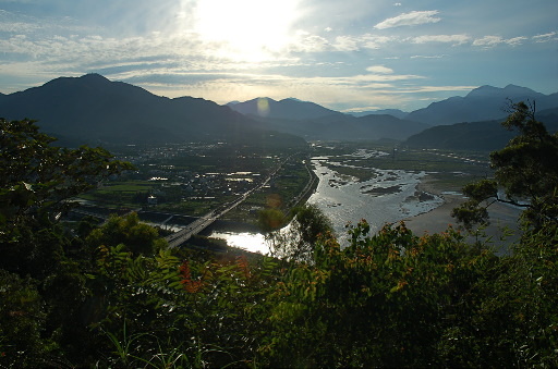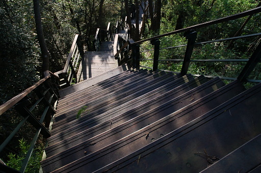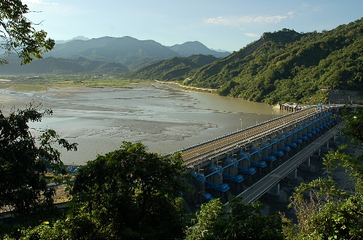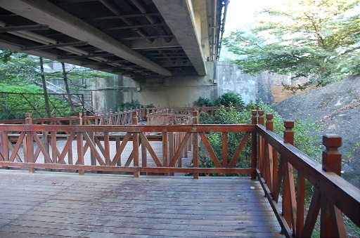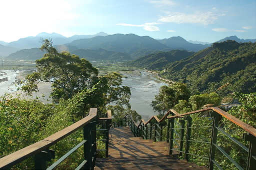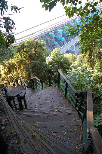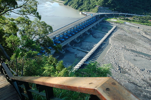 續行,循登天步道陡下往集集大橋。沿途可俯瞰集集大橋、集集攔河堰。這條木棧道極陡,比竹山的天梯還像天梯,幸好不長。 |