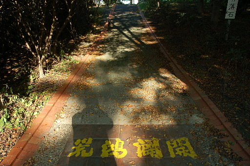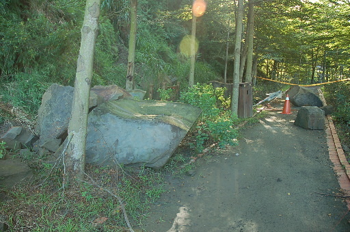 落石區,很多大石頭從獅頭山岩壁掉落在步道上,有點危險,步道因此封閉中。因想一睹『開闢鴻荒』,只好勇往直前,稍後轉為土產道,非常泥濘。不久轉為柏油小產道。H215m |