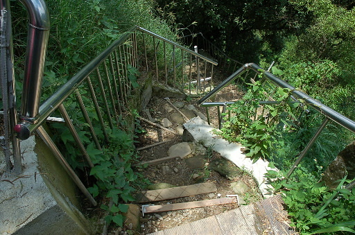 步道封閉告示牌,其實步道早已被山友修理好了,開始一路往下。步道頗陡峭,但兩側都有扶梯,其實並無什危險性。這條南側步道又稱為紅稜段步道,後來的路就不再那麼陡了,中途較少涼亭,所以遊客也較少,但步道本身比北側步道風景優美。H350m |