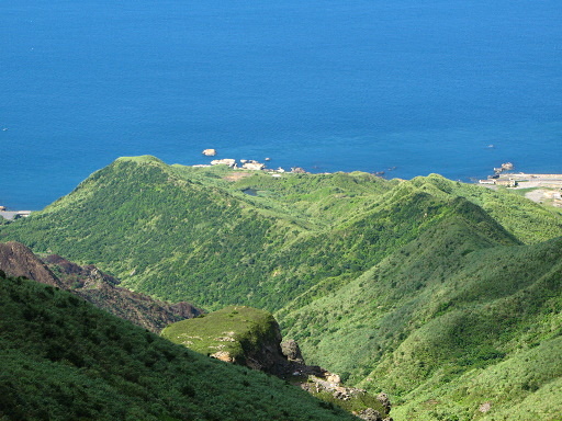 攀繩上岩稜,這個小鞍部風景不錯,風大涼爽,加上剛好天空有大片灰雲遮日,休息觀景。休息時發現有直昇機在草山戰備道附近停留,不曉得在幹嘛。H704m |