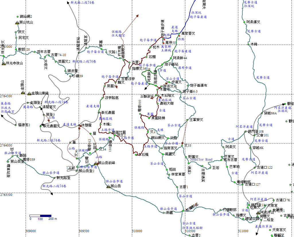 指標叉路,右緩上往新光路700m,回萬家香停車場560m,左路經過農地亦可接回炮子崙步道中途涼亭,取右。H195m |