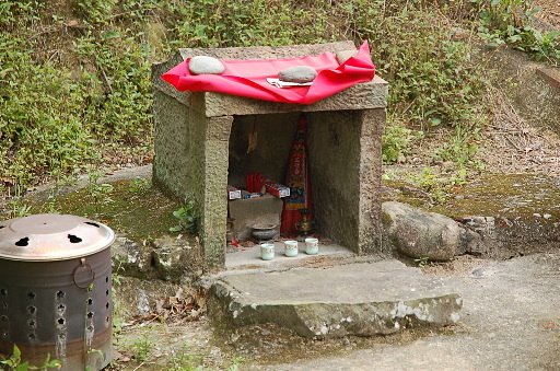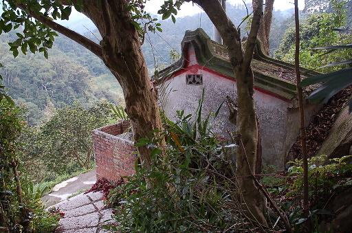 騎龍古道第三段入口,位於兩間民宅之間的伯公廟旁,指標往左,但駁坎很高,看不到步道,因此我以為是指標搞錯了,其實從民宅的斜坡往上走即可,誤行產道。H377m |