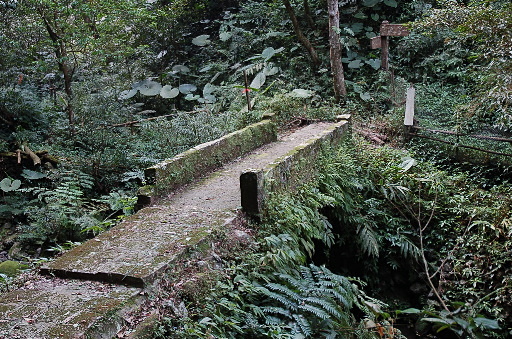 第一座糯米橋,建於民國四十七年,指標右往樂善堂、騎龍古道,右側溪邊的古道因鄰近農地架設圍欄而路幅較窄,左側山路亦有登山路條,取右。H380m |