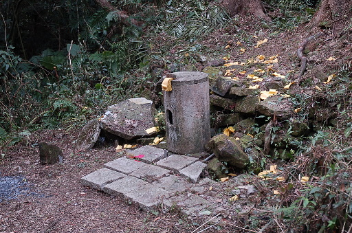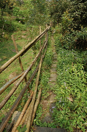 騎龍古道第二段入口,小石階步道幾乎與產道平行,無指標。進入十幾公尺後遇叉路,左往楊家石柱屋,直行往3號石橋,直行。H363m |