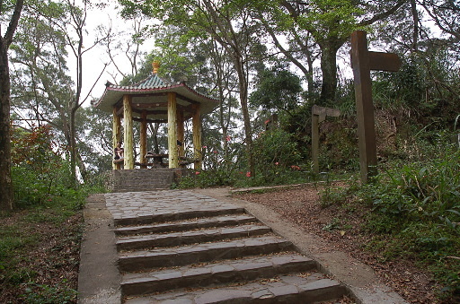 展望亭,左側出現第二段步道,車道續往前可通代勸堂,而雲谷寺就在左下方。步道口旁邊有間小伯公廟。往飛鳳夕照、相思崖600公尺。石階步道一路往上。H248m |