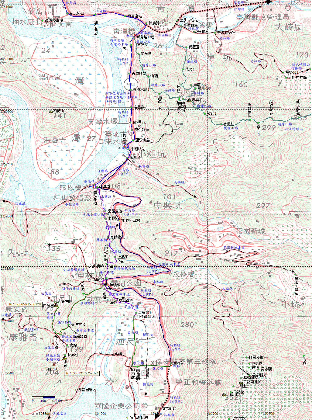 新烏路青潭站,斜對面的新烏路17巷是青潭尖的登山口,今天主要是來造訪最近才由山友告知的新烏路青潭水源基石,續行新烏路。新烏路車多,風景不錯,可遠眺塗潭山、灣潭山、碧潭山。H46m |